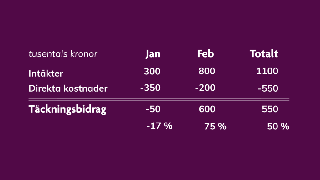 -> Det procentuella bidraget är inte jämnt mellan månaderna. Den visar inte ett sanningsenligt täckningsbidrag eftersom man inte periodiserar rätt.